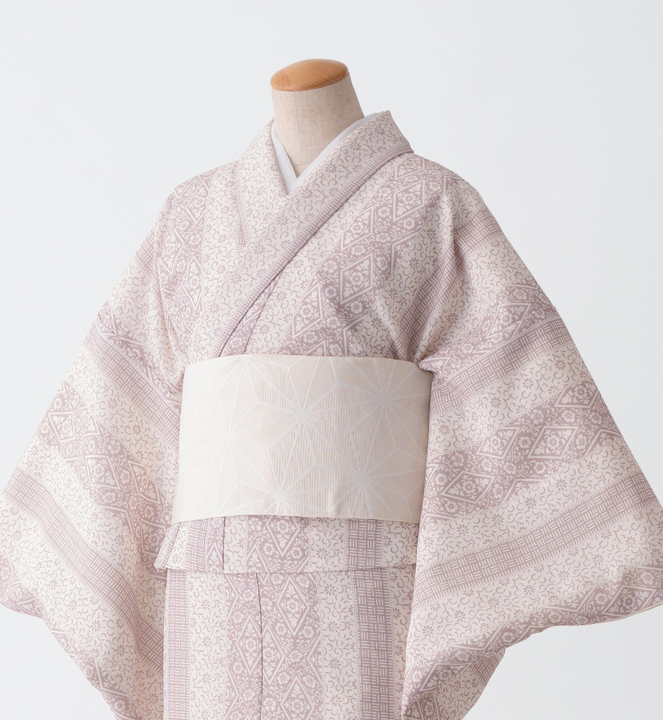 ニュアンスカラーでまとめたレース風の和柄。フェミニンスタイルで上品な印象の着姿に。
