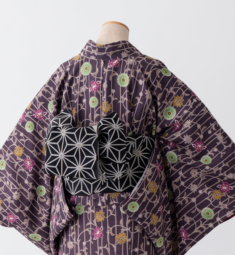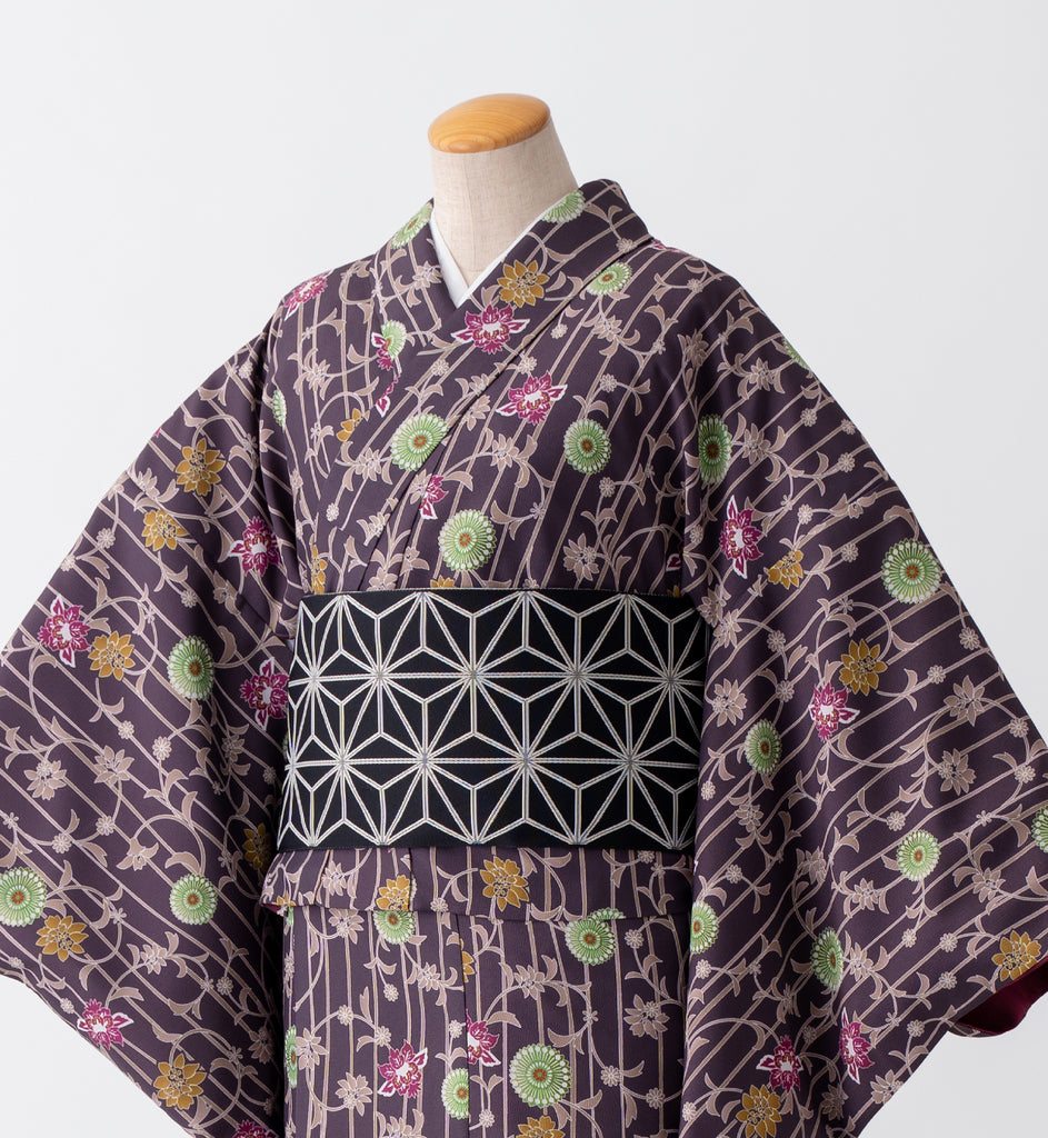 アンティークな配色に花唐草と縦縞ですっきりとした着姿に。レトロにもカジュアルにもコーデがしやすい!