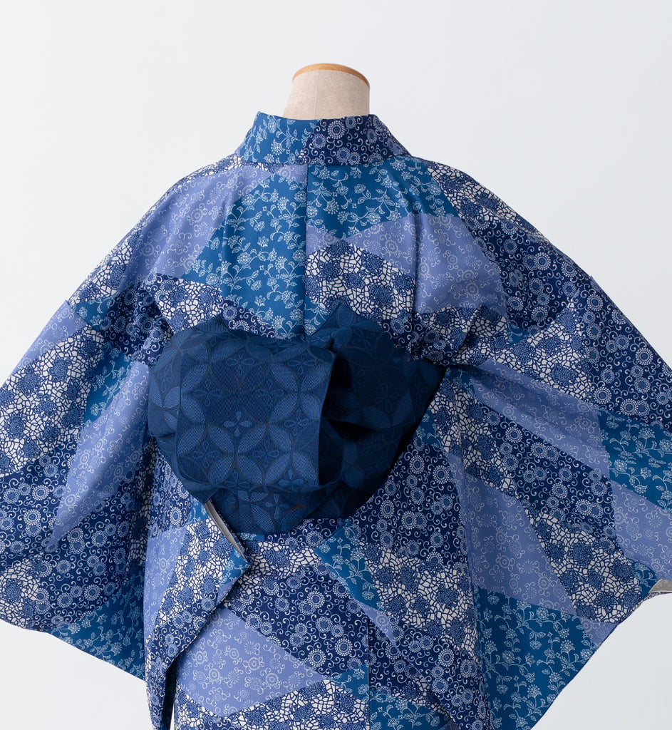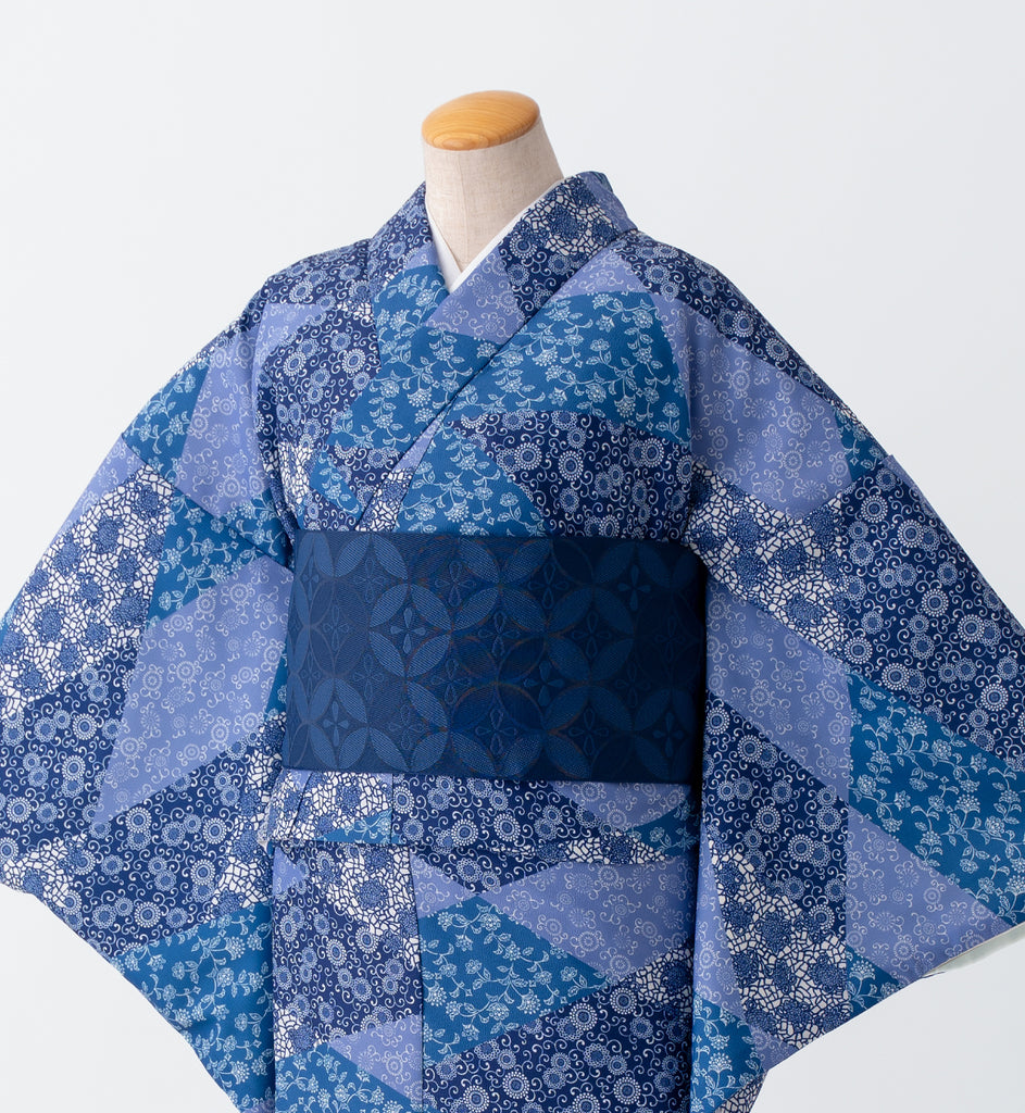 異なる柄と青系の色を組み合わせたレトロ感のあるきもの。アクセントカラーを入れたカジュアルコーデでまとめても!
