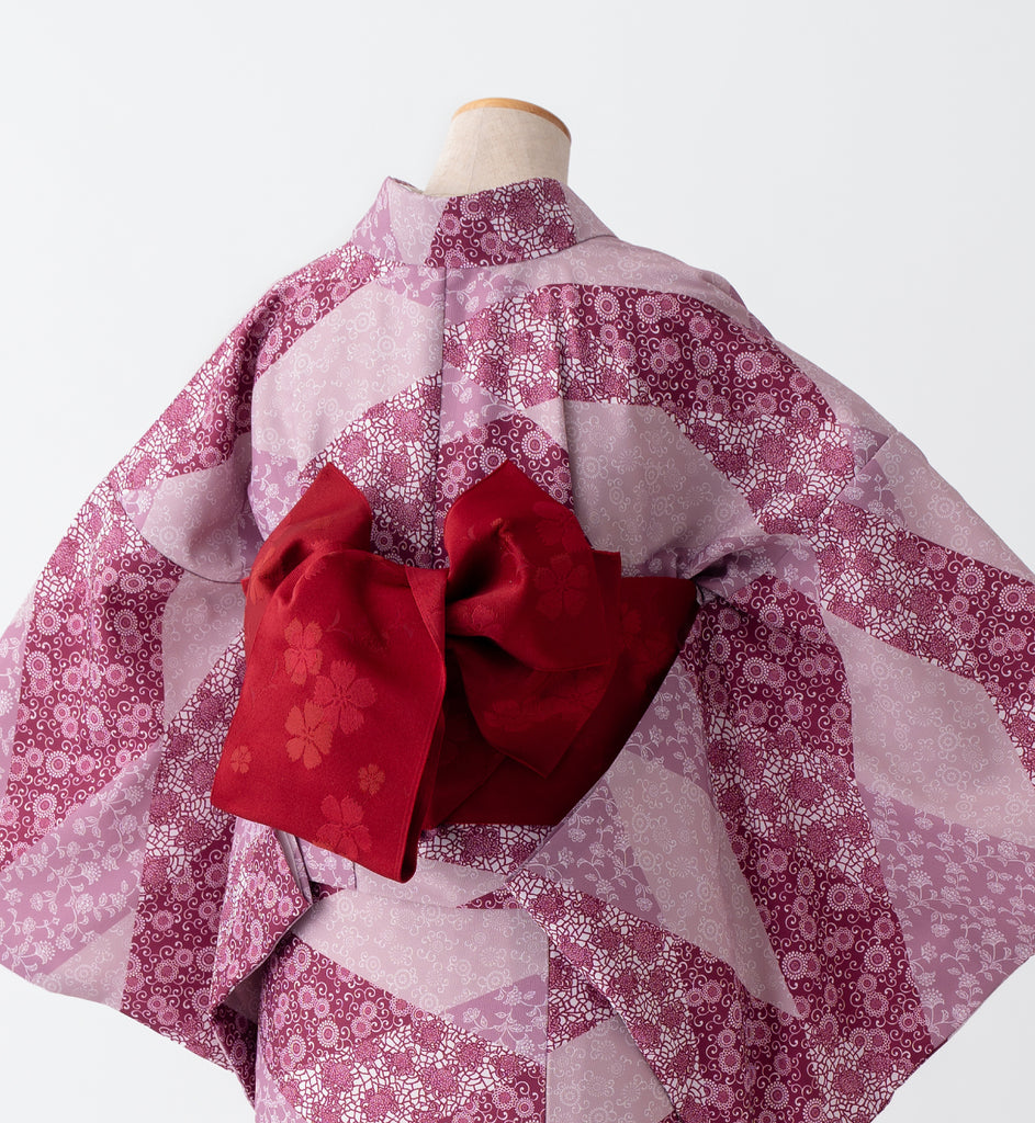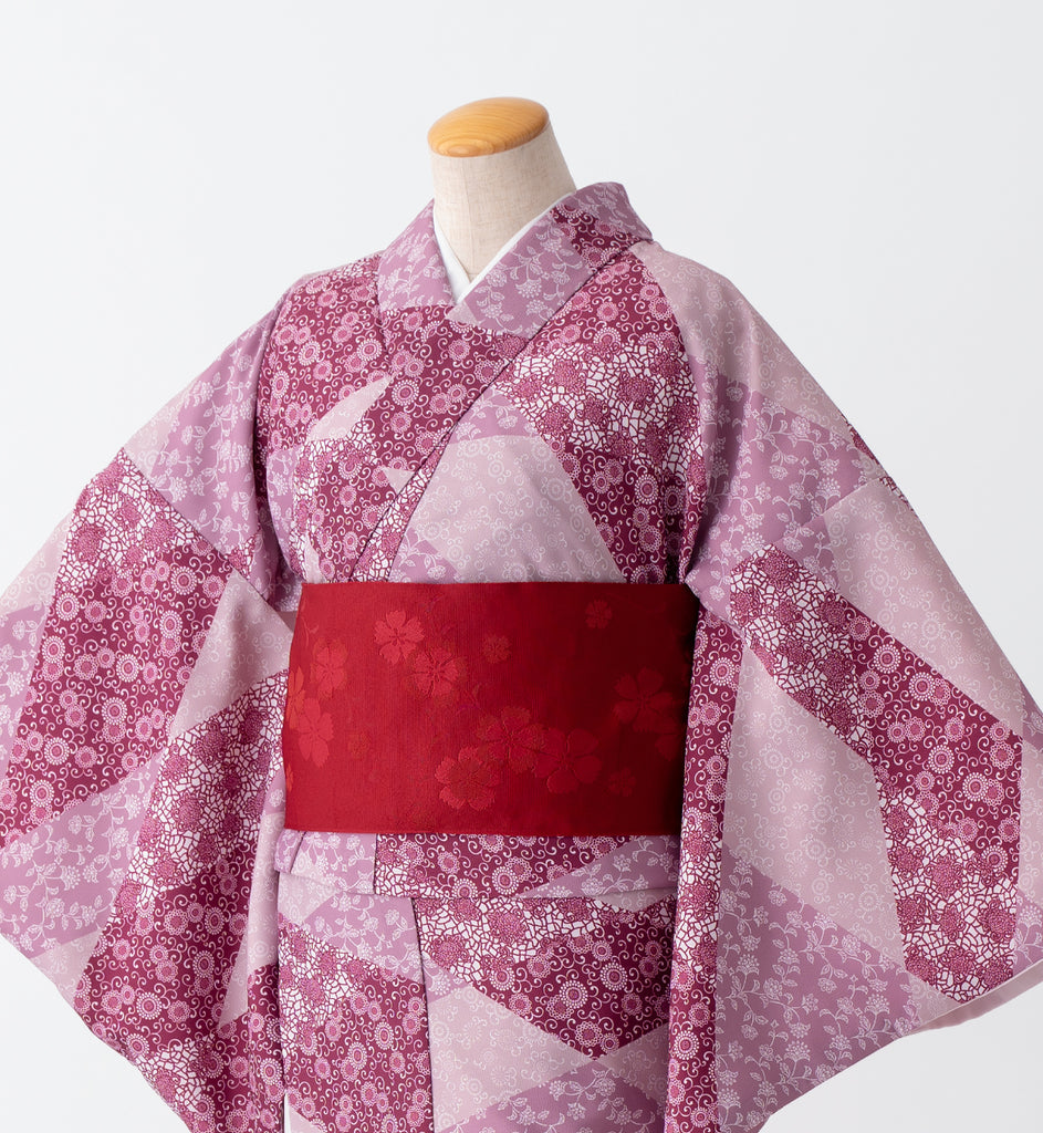 異なる柄と赤系の色を組み合わせたレトロ感のあるきもの。アクセントカラーを入れたカジュアルコーデでまとめても!